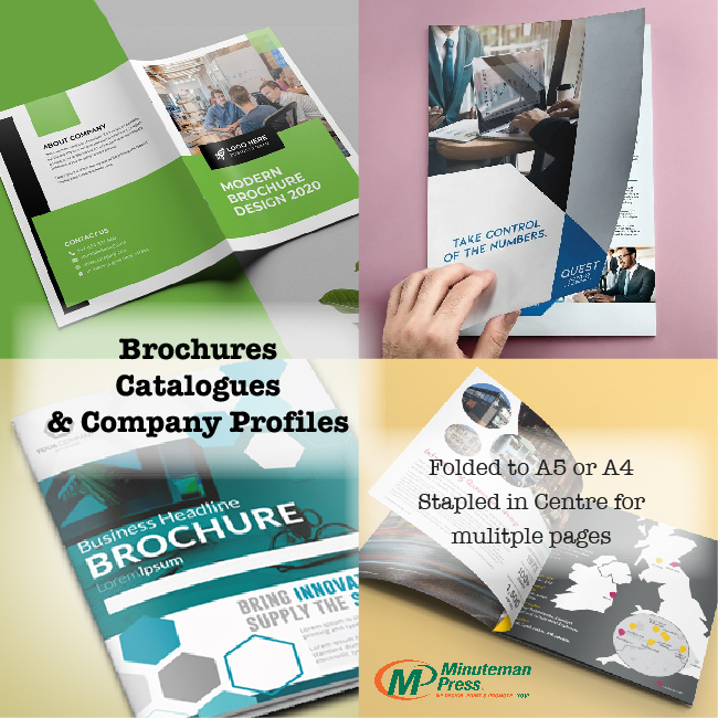 Brochures are custom made to your requirements in either A4 folded to A5 or A3 folded to A4 which can be used to promote your business services and/or products as a company profile or catalogue.