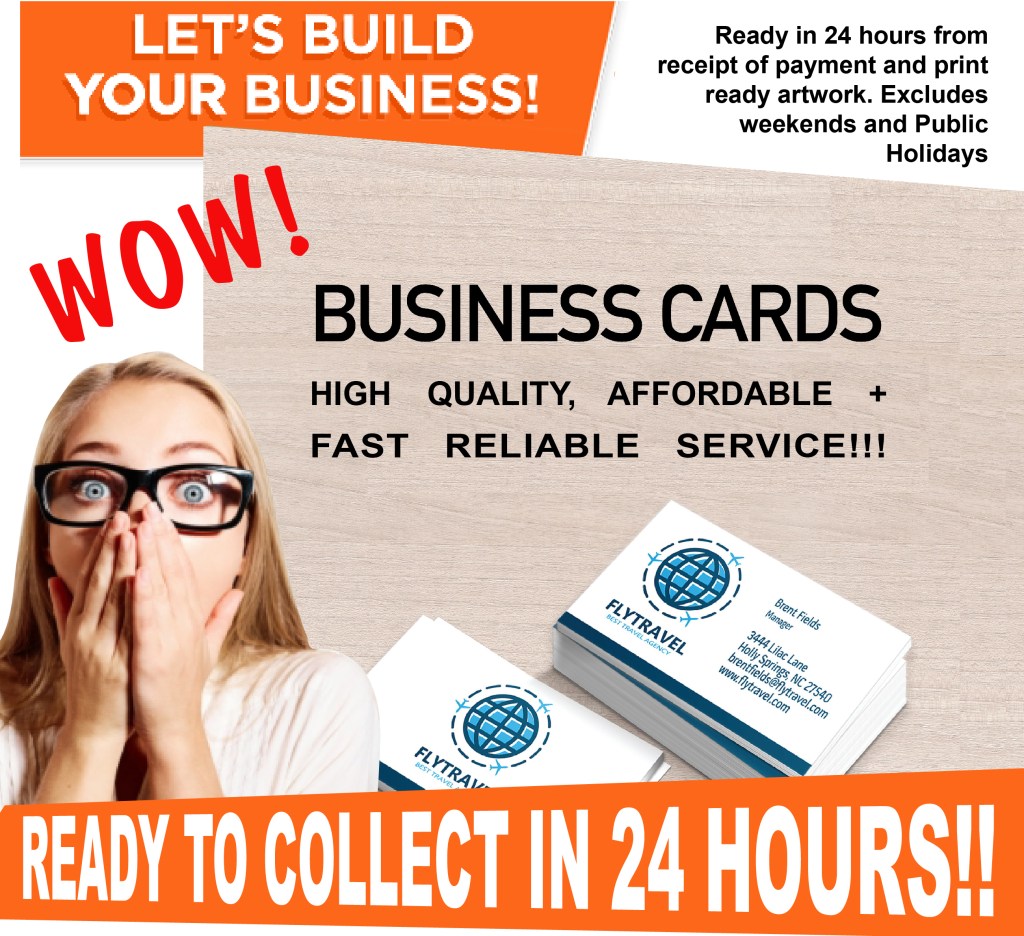 Business cards must be digitally printed either single or double sided and trimmed to 90x50mm for the 24 hour turn around.